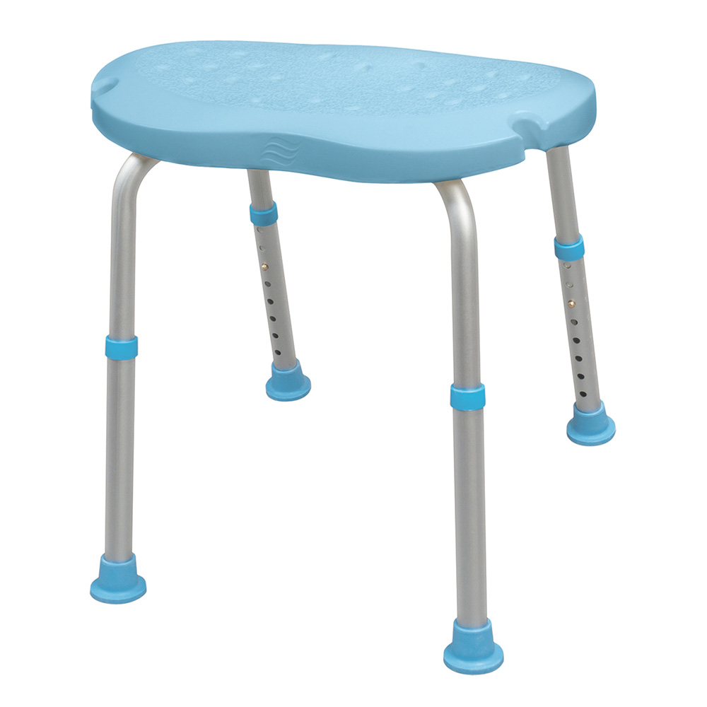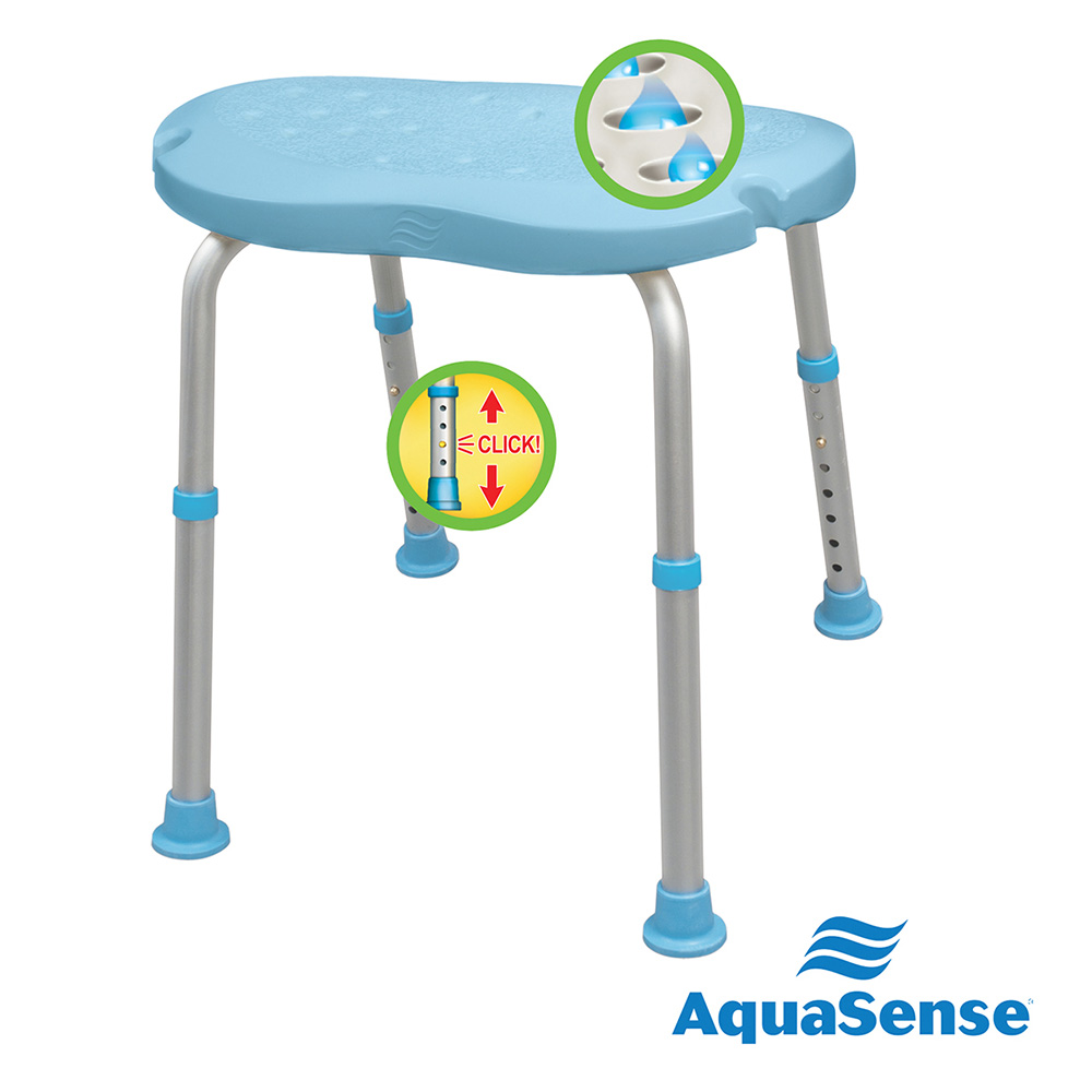 Bath and shower seats from AquaSense provide support to individuals who need to sit down while taking a bath or a shower. These bath chairs have an ergonomic contoured shape, designed to be more comfortable than traditional bath seats. This bath chair features a textured non-slip plastic seat with drainage holes for added safety and improved comfort. The adjustable legs raise or lower seat height from 15″ to 22″, while the non-slip, latex free rubber safety tips provide extra stability. All AquaSense Bath and Shower Chairs have a lightweight, corrosion resistant aluminum frame and 300 lb. (136 kg) weight capacity. This bath seat fits effectively with almost any bath mat and has easy tool-free assembly.