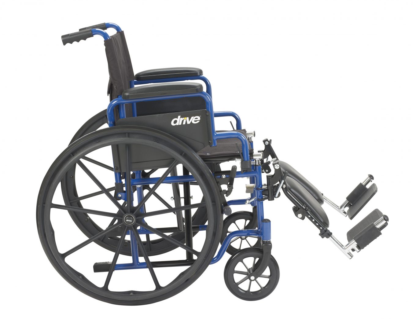 A Mobile Masterpiece of Class… Durability and Comfort The Blue Streak Wheelchair from Drive Medical represents a new class of leading-edge mobility enhanced wheelchairs that have been engineered and structured, to not only meet, but exceed the growing demands and expectations of users who cherish independence, mobility and comfort. It arrives at your door loaded with features designed to enable and enhance your mobility and comfort. Arm rests are fully padded. The frame, black cross brace and the nylon upholstery is durable, attractive and easy to clean. The tires which are made of solid rubber, give you an enormous amount of durability. If that wasn’t enough, this leading edge mobility aid also requires little to no maintenance. Users also appreciate that The Blue Streak Wheelchair comes with easy to operate push to lock brakes. You’ll also appreciate the padded desk arms which furnish you with unbeatable comfort, allowing you to slide up as close as you desire, and need to be to tables, and or desks. Available with 16″, 18″, or 20″ width seats and with Swing Away Footrests or Elevating Legrests. Go ahead…Experience the Drive Difference Now!