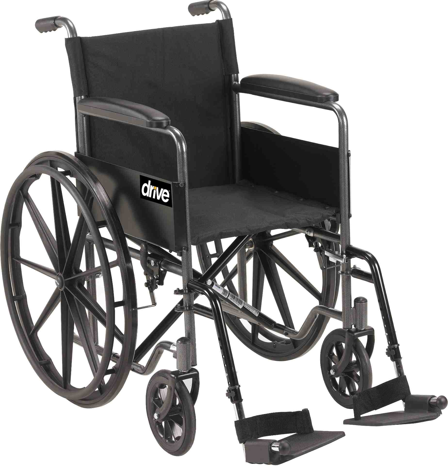 The Silver Sport I Wheelchair with Fixed Arms and Swing Away Footrests by Drive Medical comes in an attractive powder coated, easy to maintain silver vein finish, and a steel frame for durability. The urethane tires are mounted on composite wheels to provide durability and a smooth ride over most surfaces. The convenient carry pocket on the backrest provides an easy and safe way to transport personal items. The nylon upholstery is durable, lightweight, attractive and easy to clean. Comes standard with swing away footrests, push to lock brakes and plastic footplates.