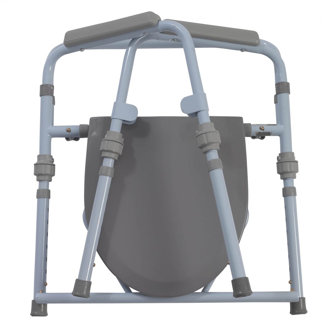 The deluxe folding bedside commode by Drive Medical is designed to meet your needs. The frame can be configured to be used as a bedside commode, toilet safety frame, elevated toilet seat, or put over your existing toilet. The tool free removable back makes configuring the commode easy for any application. The armrests provide a comfortable place to rest on when sitting and indicate a safe place to grab making sitting and standing easier. The push button height adjustable legs makes sizing a breeze allowing this commode to be used as an elevated toilet seat. In addition to comfort this commode can be folded with out tools making storage and travel convenient. The blue power coated steel welded construction ensures strength and durability able to hold up to 350 pounds. The product comes complete with a snap on seat and lid, 7.5-quart commode bucket with cover and convenient carry handle, plus splash guard.