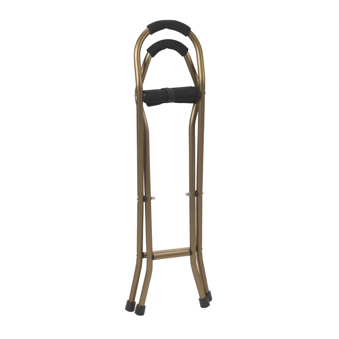 This deluxe folding aluminum seat cane by Drive Medical features convenience right out of the box. Ideal for individuals on the go this cane can be used as a resting seat or traditional walking cane. The sling material provides a comfortable seat for resting when opened. When closed this cane increases mobility and ensures maximum safety and security. Strong aluminum bronze construction and four sturdy legs with vinyl contoured tips can support a weight capacity of 250 pounds. The 15″ x 6″ nylon sling seat sits 22″ from the floor when open, while the cane stands 34″ tall when closed and weighs just 2.4 pounds. Foam grip handles on both arms provide additional comfort.