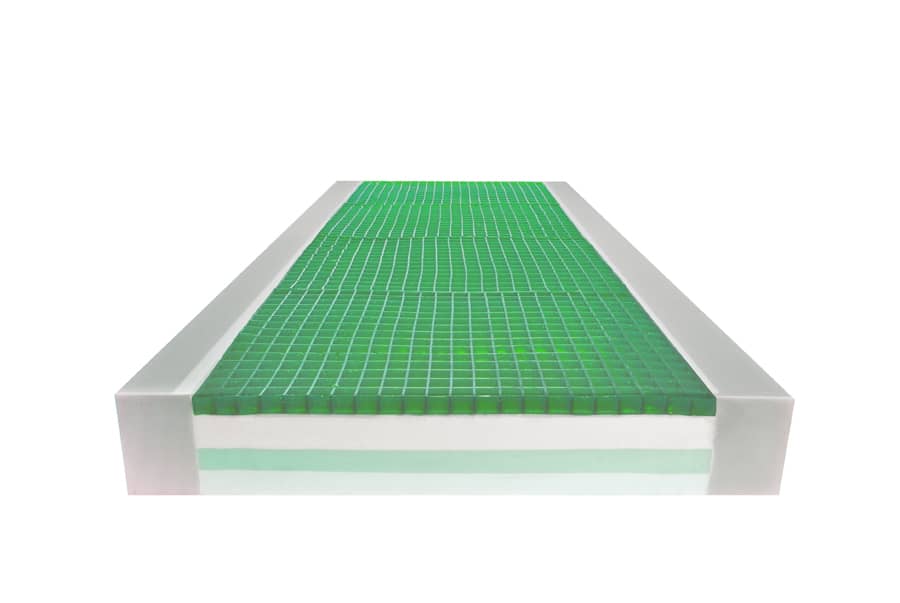A dual density foam base and firm side bolsters with a 1” high green gel overlay