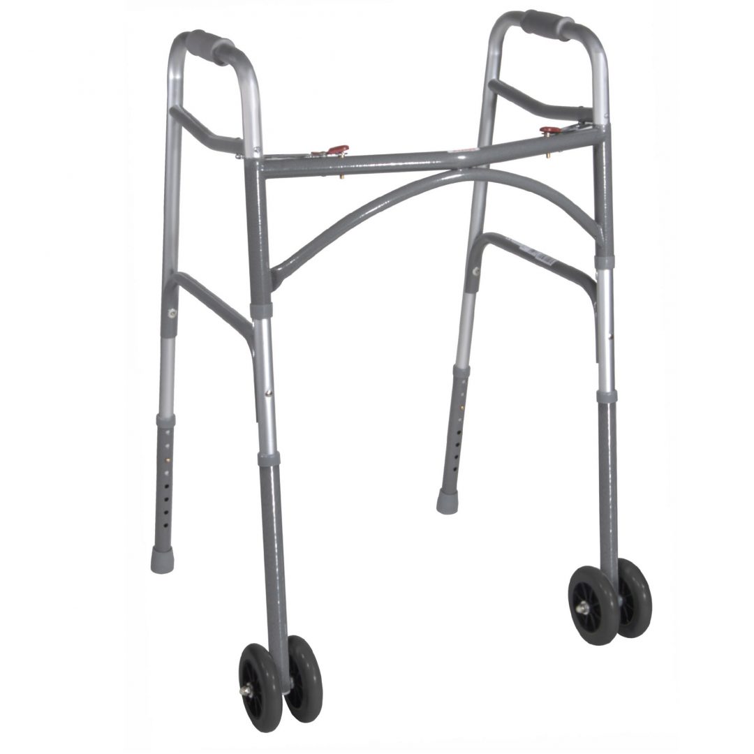 The Bariatric Aluminum Two Button Folding Walker with 5″ dual front wheels by Drive Medical now comes in a wider and deeper frame designed to accommodate individuals up to 500 pounds. The precision design provides additional strength while adding minimal weight to the walker. The “U” brace, steel legs and side brace ensure security and stability. The 5″ dual front wheels provide a smooth walk and negate the need to pick up the walker with each step.