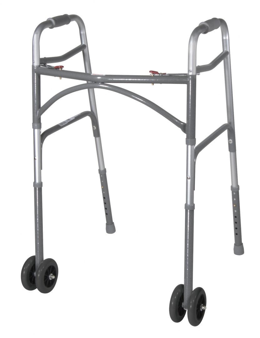 Dual, rubber wheels allows walker to roll easily and smoothly over irregular surfaces