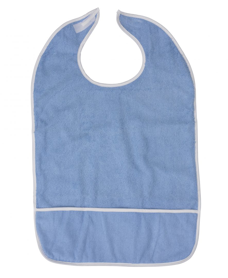 Terry cloth bib with bias binding and adjustable hook and loop fastener closure