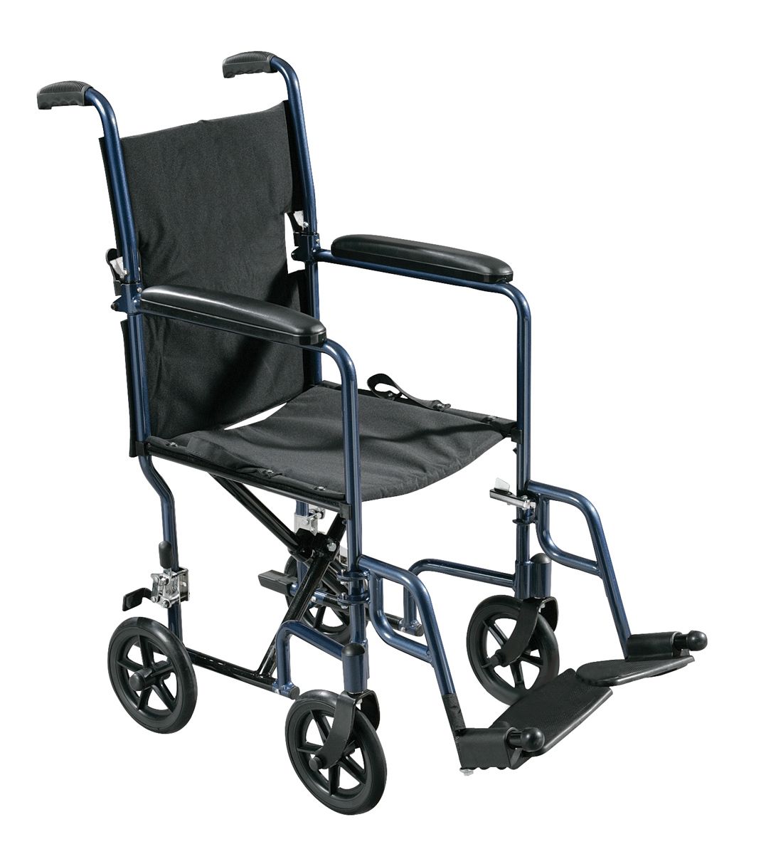 The Aluminum Transport Chair by Drive Medical is lightweight and strong, making it easy to transport. The black, nylon upholstery is comfortable, lightweight and easy to clean. The wheels are lightweight, maintenance free and provide a smooth ride over most surfaces. It comes standard with swing away footrests and padded armrests to provide additional comfort and rear wheel locks to ensure safety. Easily folds for convenient storage and transportation.