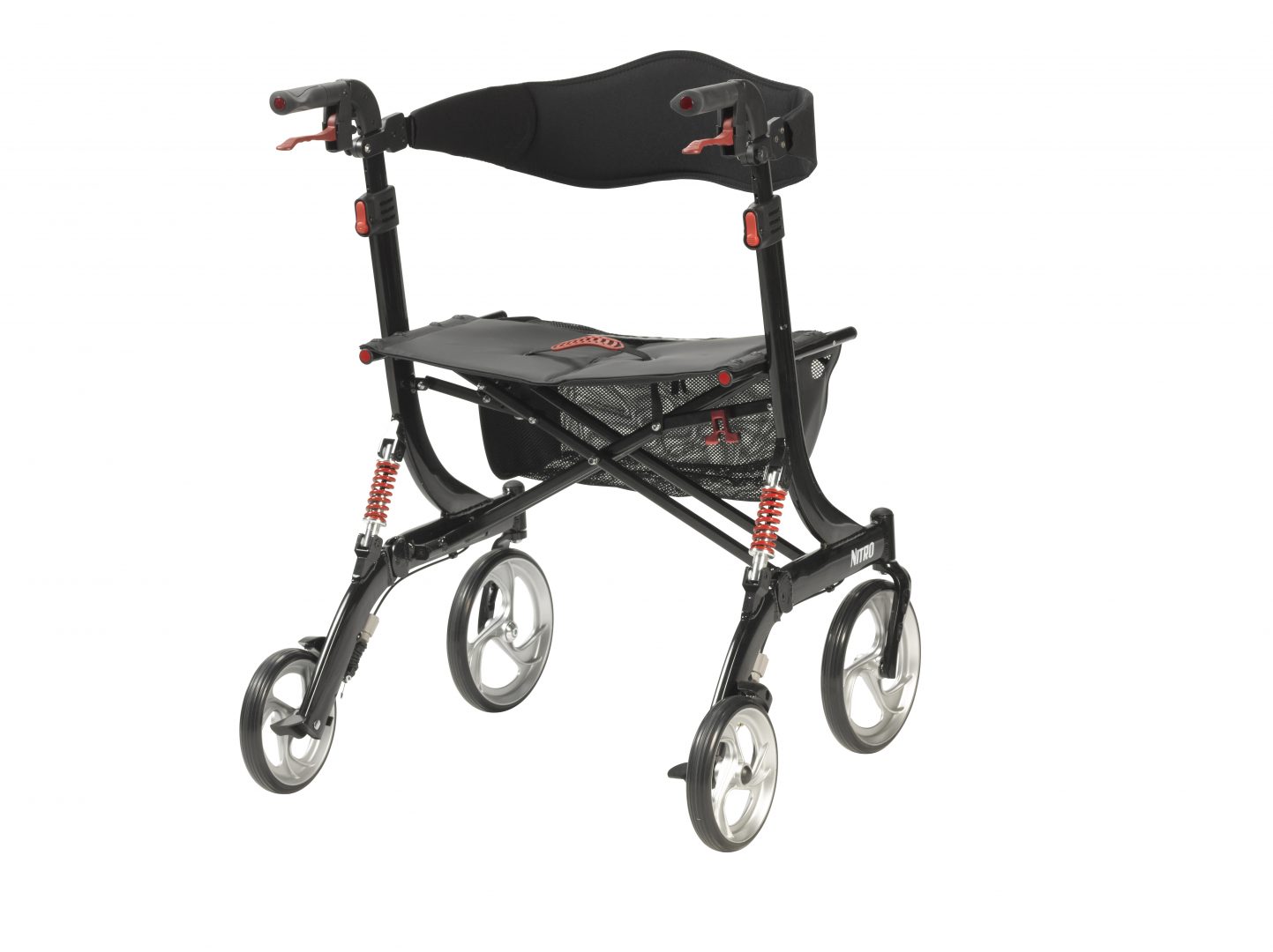 If you’re seeking a safe, convenient aid to improving your daily mobility, a Rollator can be the ideal solution. Wheels make a Rollator a superior option over a standard walker, eliminating the need to lift the device and allowing you to walk with an easy, smooth gait. Plus, Rollators are better for traveling over uneven, outdoor terrain, making them great for your active, busy lifestyle. And with the built-in seat found on a Rollator, you’ll always have a convenient place to rest. Featuring revolutionary design and eye-catching style, the Nitro has exploded onto the Rollator scene. The Nitro’s caster fork design allows for an enhanced turning radius while the 10″ front casters allow optimal steering and rolling comfort. In addition, the Nitro locates brake cables within the unit’s frame for safety and offers quick and easy tool-free adjustment to the handle height and back support. Plus, the Nitro easily folds with one hand to ultra-compact size for storage. The Nitro HD provides easy mobility for users up to 450 lbs with a wider seat and a unique suspension system for support and comfort.