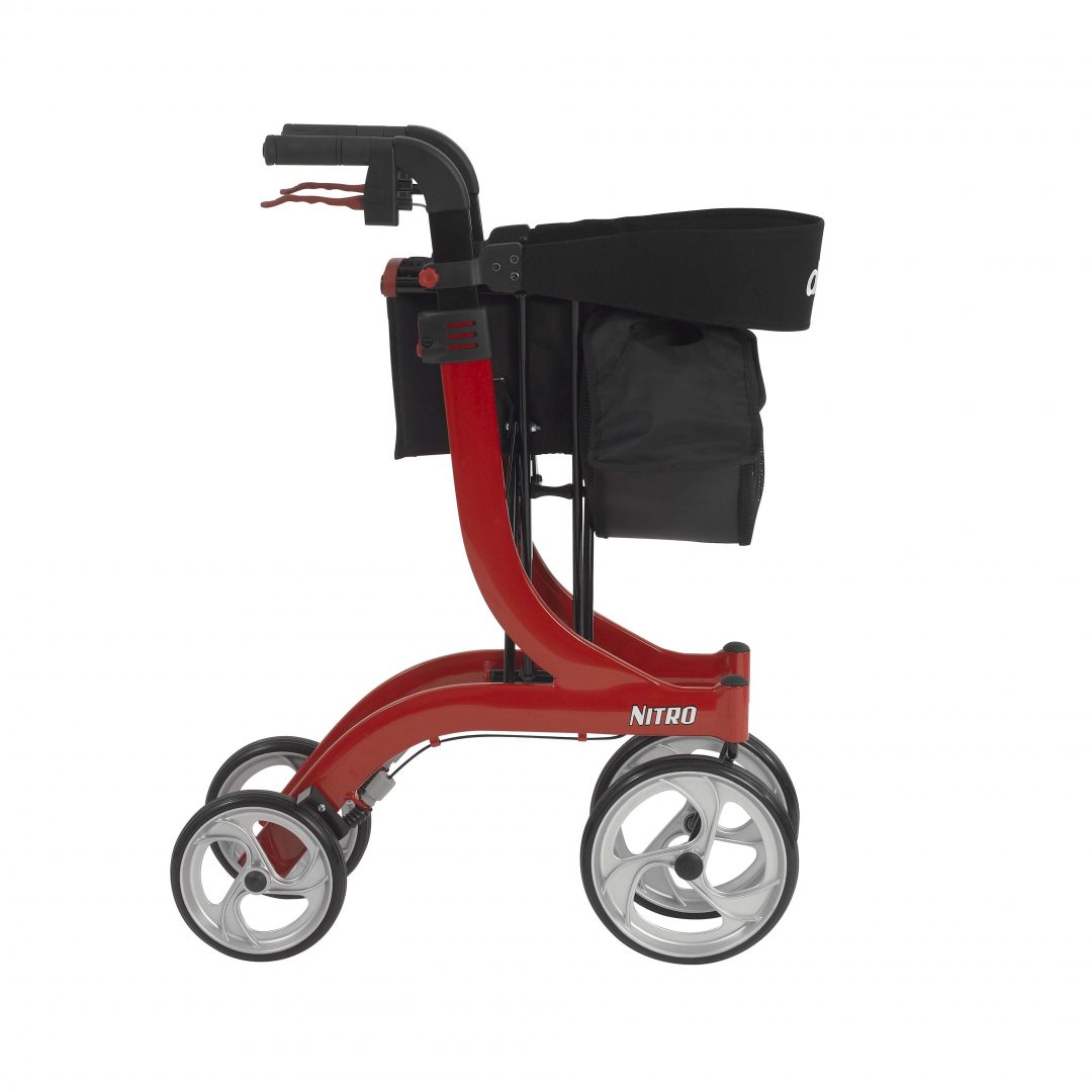 Drive Medical’s Nitro Euro Style Rollator Walker is the ultimate mobility solution that marries advanced reliable features with a sophisticated exterior. The durable frame is made of lightweight aluminum so it’s easy to maneuver on any indoor/outdoor terrain, and strong enough to withstand extended daily use. To ensure maximum safety, the brake cable is built into the frame, enhancing the sleek appearance. The Nitro Euro Style Rollator Walker has unrivalled folding capabilities: it easily collapses to an ultra-compact size with one hand by pulling the seat grip up and bringing the ergonomic, height-adjustable handles together so they almost touch. To further offer customized comfort, the removable back is also height-adjustable, and the luxury seat is made of easy-to-clean nylon. Enjoy the complimentary removable zippered storage bag for secure convenience of all your personal belongings whenever travelling with your new Drive Medical Nitro Euro Style Rollator Walker.