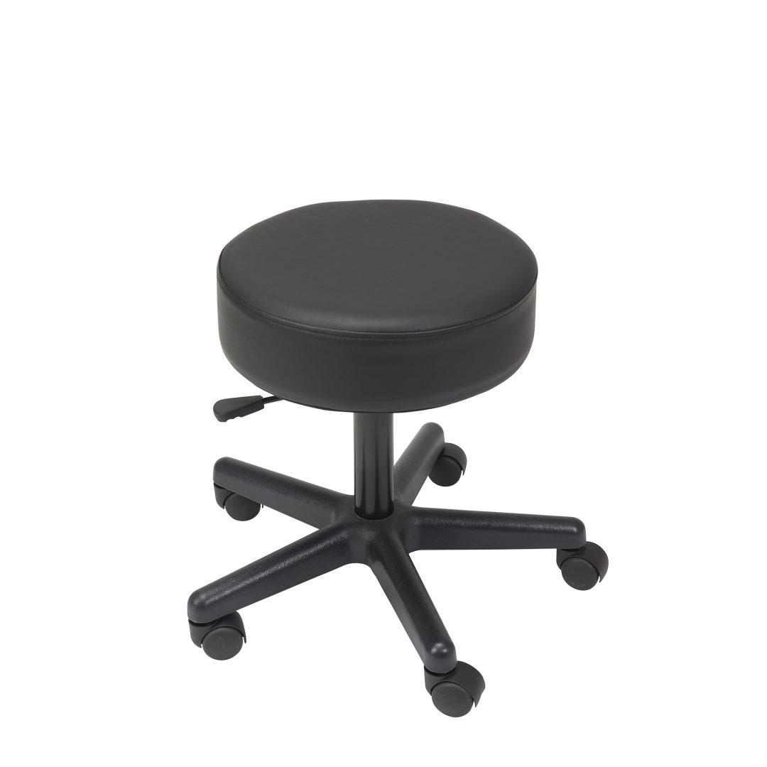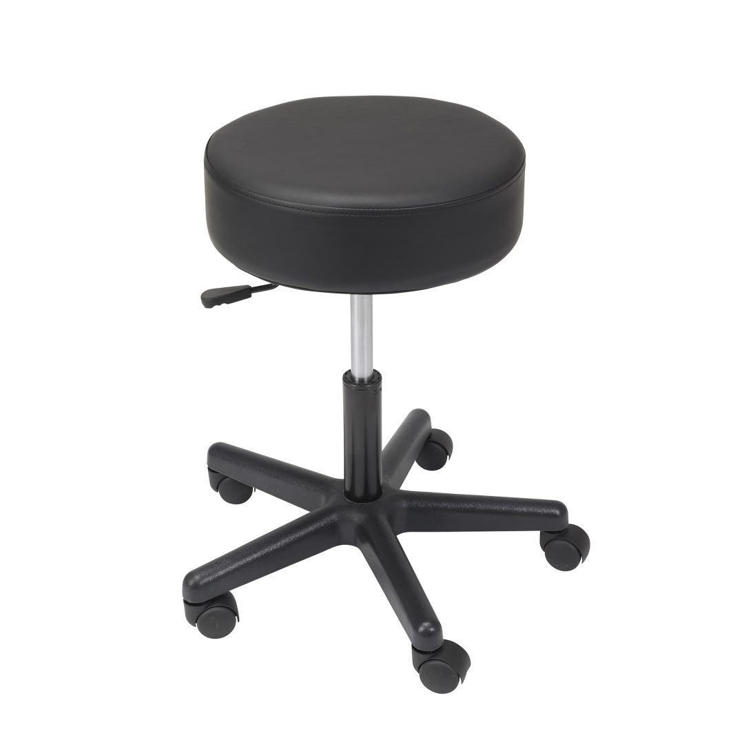 Pneumatic adjustment provides easy-touch height adjustment on this stool by Drive Medical. The revolving 14″ round seat is padded with 4″ of comfortable thick black padding. It leads to a solid steel shaft and standard composite plastic or metal base that doesn’t skimp on strength and security, as evident in the 250 pound weight capacity. Of course, 5 casters allow easy mobility around the room.