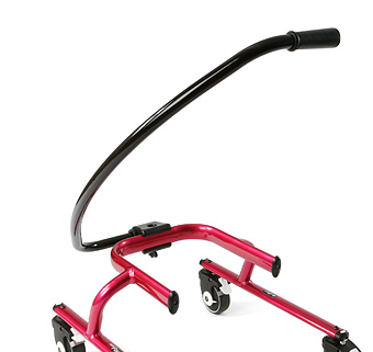 The optional attendant guide bar attaches to the center front of the top bar of any size Pacer. It enables caregivers to guide clients while gait training, and can be rotated 180° to pull from the front or push from behind the Pacer.