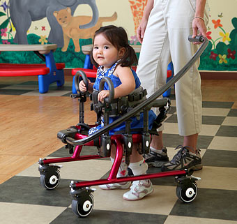 Olivia’s caregiver is guiding her first steps in a mini Pacer.