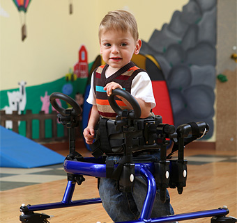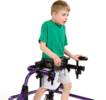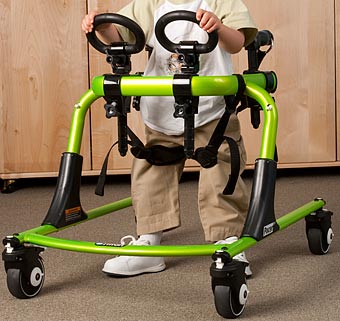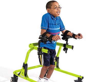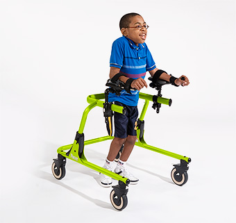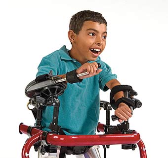 Jamir has achieved enough leg strength and trunk stability to use only the arm prompts for weight-bearing support. Placed at elbow height aligned with shoulders, arm prompts assist partial weight-bearing gait training.