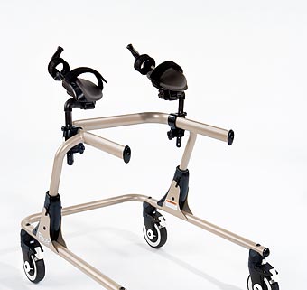 Thigh prompts swing with the user’s stride and prevent leg scissoring. They are height adjustable in the medial and lateral positions and prevent user from turning within the Pacer frame.