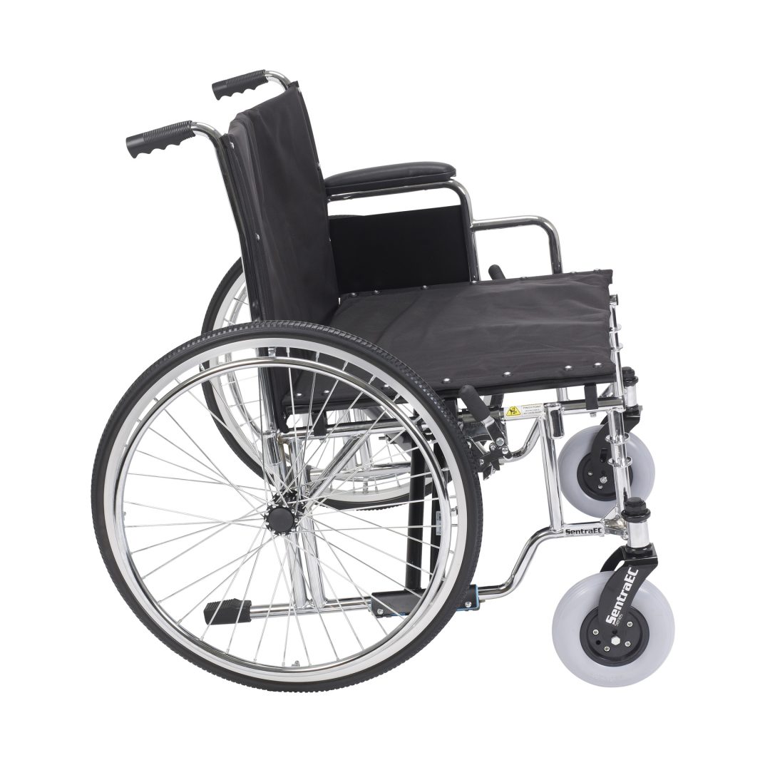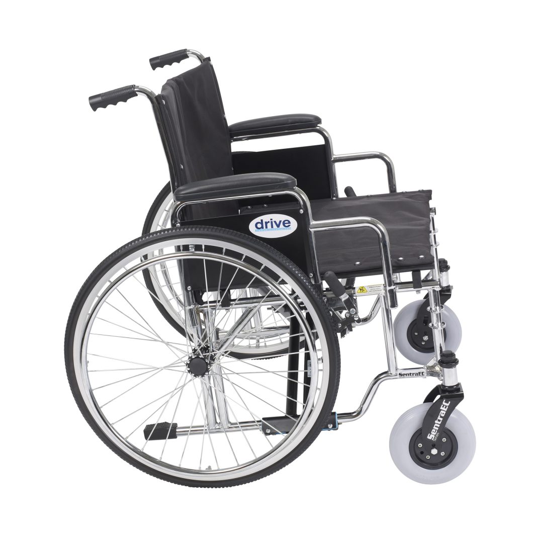 The Sentra EC Extra Wide Heavy Duty Wheelchair from Drive Medical boasts a 700 pound weight capacity, made possible through the use of reinforced steel gussets, reinforced nylon upholstery, reinforced side frame, extra heavy duty front forks and casters, and dual cross bars. The stylish triple chrome coated steel frame and steel spoke wheels add a touch of elegance to this bariatric wheelchair. Available in various arm styles and seat widths, the right wheelchair exists for you.
