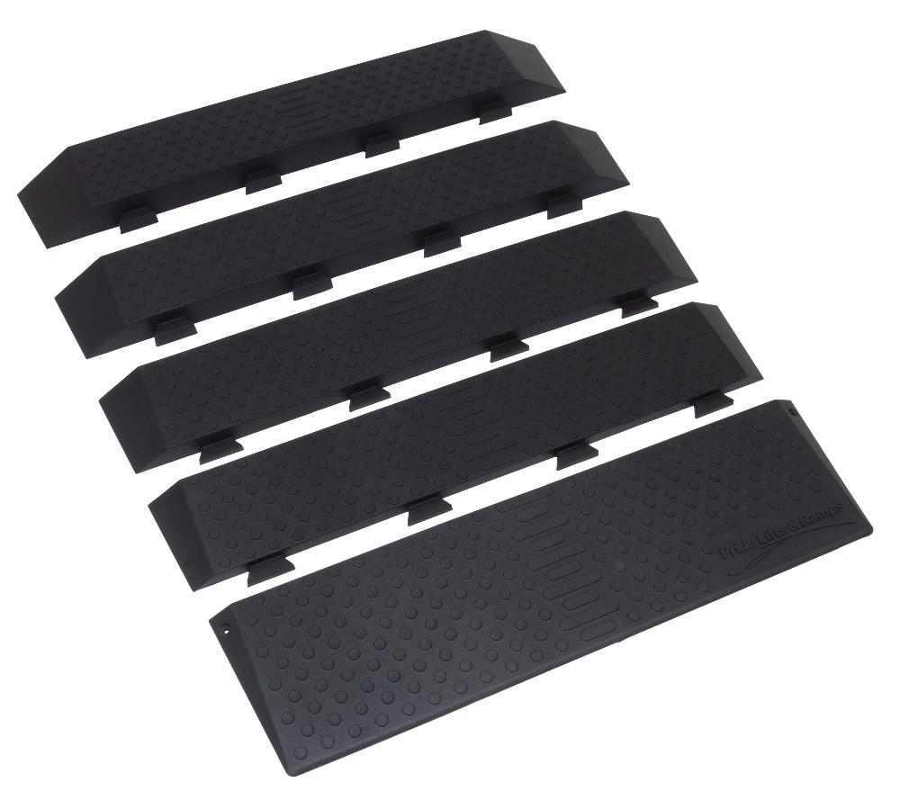 Rubber Threshold Ramps from Pride® Lifts and Ramps provide a durable, safe means of navigating uneven household surfaces including small steps and doorways. A hidden dovetail locking system allows for easy installation and incremental ramp height adjustment of up to 4 inches.